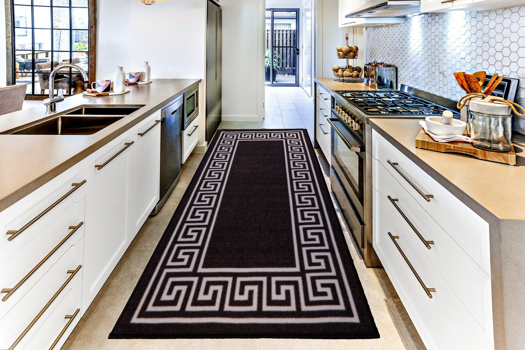 Greek Key Collection – Classic Washable Mats. Timeless Greek key border on an easy‑care, machine‑washable pile. Non‑slip and durable – ideal for kitchens and hallways.